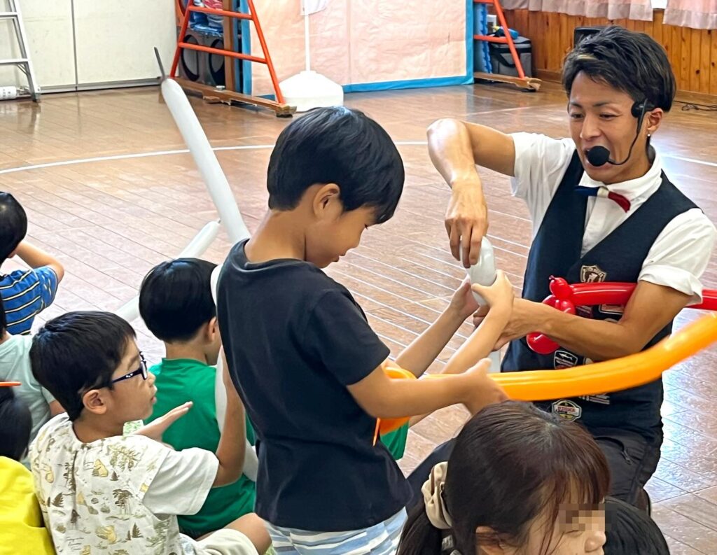 帽子とバルーンを自由自在に操り、大技も難なくこなすハットマンPepEさんの多彩な技と楽しさを爆発させるトークに子どもたちは大盛り上がり。夏のひと時をみんなと楽しく過ごしました。子どもたちの良い思い出になると良いな!